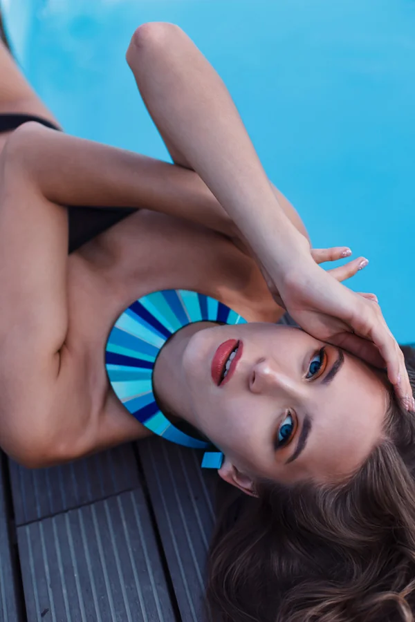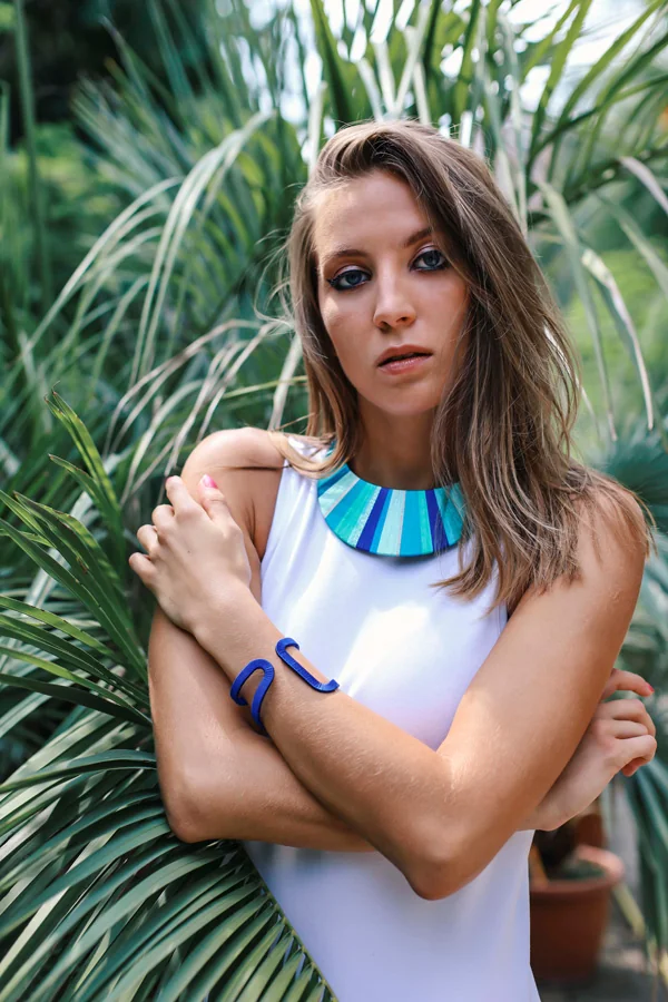 Szatén hímzőfonalból és újrahasznosított műanyagból készült nyakék kék, türkiz és ezüst színekben.