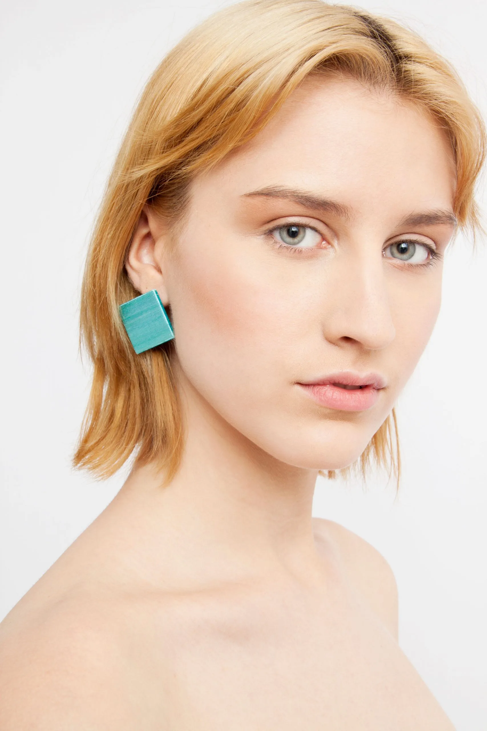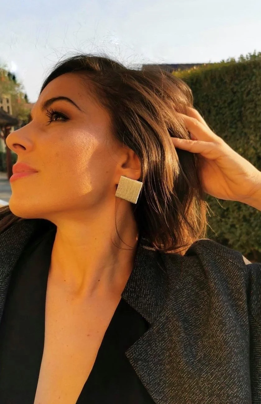 Újrahasznosított műanyagból és hímzőfonalból készült fülbevaló.
